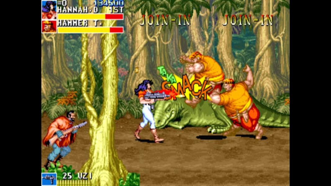 Cadillacs and Dinosaurs(CAP): Warriors of Fate fell flat last year because of its repetitive game design, but Capcom learned their lesson for Cadillacs and Dinosaurs. Characters have more diversity not only in their special moves, but each of them also have their own sets of dialogue for the story, of which there is much more of one. In fact, the ridiculous story of going up against dinosaurs, Fist of the North Star-type punks and mutated mad science made me think of SNK’s beat-em-ups like Mutation Nation. Rest assured though, it has all the Capcom brawler staples, like the dash attack, 360 attack and weapons. There is quite a lot of weapons, in fact, if not in variety then it the number dropped by enemies, making it so the game is never keeping you purely unarmed for long. It’s a satisfying combat sequence when you quickly pick up a rifle, hit enemies at a distance until you run out of ammo, then throw the gun at them and start beating down enemies closing in behind you with your good old-fashioned martial arts.